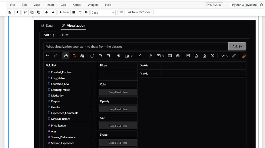 Now, The dataset will be loaded into your Python environment, and PyGWalker will provide an interactive interface for exploring the dataset’s contents, including its structure, columns, and values.